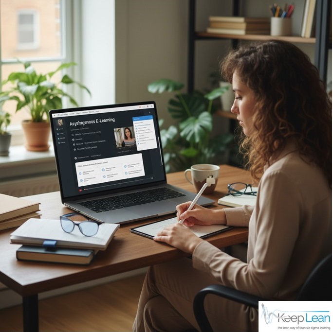 Asynchronous e-learning with interactive simulators and quizzes, perfect for flexible schedules in Lean Six Sigma while boosting engagement