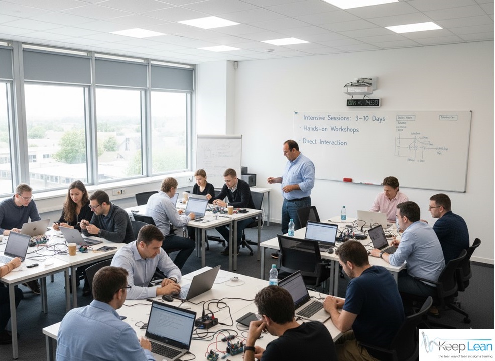 Offers intensive, immersive sessions (5–10 days) with hands-on workshops, fostering deep engagement and real-world skill application in Lean Six Sigma.